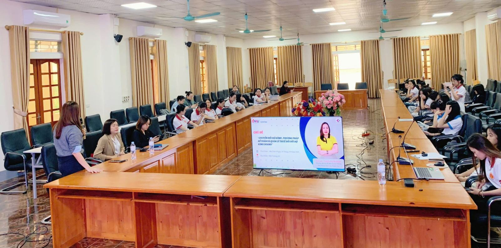 Talkshow “Chuyển đổi mô hình, phương pháp kế toán và quản lý thuế đối với hộ kinh doanh” 30/10/2025 10:34 945 lượt xem Hành trình học hỏi – Kết nối – Trưởng thành cùng CLB Kế toán NAU! Chiều ngày 29/10/2025, CLB Kế toán – Trường Đại học Nghệ An đã tổ chức thành công buổi Talkshow chuyên môn với chủ đề: “Chuyển đổi mô hình, phương pháp kế toán và quản lý thuế đối với hộ kinh doanh” Buổi chia sẻ cùng chị Nguyễn Thị Mỹ Hạnh – Trưởng phòng Kinh doanh MISA khu vực Nghệ An đã mang đến cho sinh viên những kiến thức thực tiễn, góc nhìn mới mẻ và cảm hứng nghề nghiệp Đây không chỉ là cơ hội để học hỏi, mà còn là dịp để các thành viên CLB và sinh viên Khoa Kế toán được trải nghiệm, kết nối và lan tỏa tinh thần yêu nghề – yêu ngành kế toán Chúc mừng buổi talkshow thành công. Chúc CLB Kế toán có thêm nhiều buổi đào tạo về chuyên môn chất lượng hơn nữa.