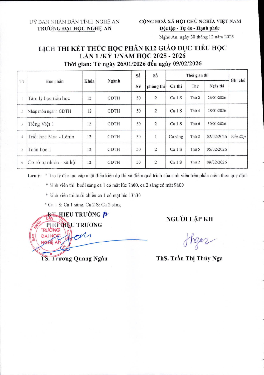 Lịch thi kết thúc học phần K47 Giáo dục mầm non và K12 Giáo dục tiểu học - Lần 1/Kỳ 1 năm 2025-2026 30/12/2025 09:05 332 lượt xem
