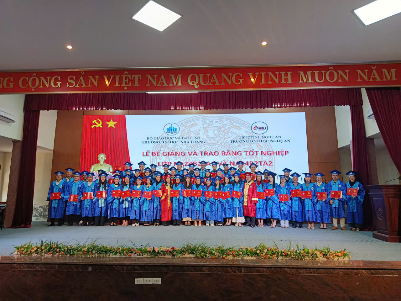 Để ghi nhận sự thành công đó ngày 10/01/2026 Trường Đại học Nghệ An phối hợp trường Đại học Nha Trang tổ chức lễ bế giảng và trao bằng Tốt nghiệp cho 124 học viên các lớp NA24B2TA1 và NA24B2TA2 niên khóa 2024-2026 tốt nghiệp tại trường Đại học Nghệ An