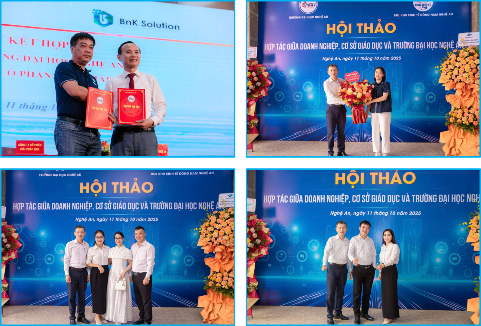 KHOA CÔNG NGHỆ THÔNG TIN – TRƯỜNG ĐẠI HỌC NGHỆ AN GỬI LỜI CHÚC MỪNG NHÂN NGÀY DOANH NHÂN VIỆT NAM 13/10 13/10/2025 07:44 282 lượt xem Nhân Ngày Doanh nhân Việt Nam (13/10/2025), Khoa Công nghệ Thông tin – Trường Đại học Nghệ An xin gửi tới Quý Doanh nghiệp, Đối tác và Cựu sinh viên đang hoạt động trong lĩnh vực kinh doanh, khởi nghiệp và công nghệ lời chúc sức khỏe, thành công và thịnh vượng. Trong hành trình phát triển và hội nhập, Khoa CNTT luôn trân trọng sự đồng hành, hợp tác quý báu của các doanh nghiệp trong việc hỗ trợ sinh viên thực tập, kết nối việc làm, đồng tổ chức hội thảo chuyên đề, và triển khai các dự án nghiên cứu – ứng dụng thực tiễn. Sự hợp tác bền chặt giữa nhà trường và doanh nghiệp chính là cầu nối quan trọng giúp sinh viên tiếp cận môi trường làm việc thực tế, đồng thời góp phần nâng cao chất lượng nguồn nhân lực công nghệ thông tin tại khu vực Bắc Trung Bộ. Xin gửi lời chúc thành công, thịnh vượng và phát triển bền vững tới Công ty Blueline Solution – Chi nhánh Nghệ An và Công ty Cổ phần Wowup JSC – Chi nhánh Nghệ An, hai đơn vị luôn tích cực hợp tác, hỗ trợ sinh viên trong trong công tác đào tạo, nghiên cứu và kết nối việc làm và khởi nghiệp cho sinh viên CNTT - NAU. ✅ KHOA CÔNG NGHỆ THÔNG TIN, Trường Đại học Nghệ An (NAU) 🏫 Tầng 2, nhà D, Số 51 Lý Tự Trọng, Phường Vinh Phú, Nghệ An. 🌍 Https://nau.edu.vn/cntt 💌 Khoacntt@nau.edu.vn 🎞️ TikTok: IT.NAU