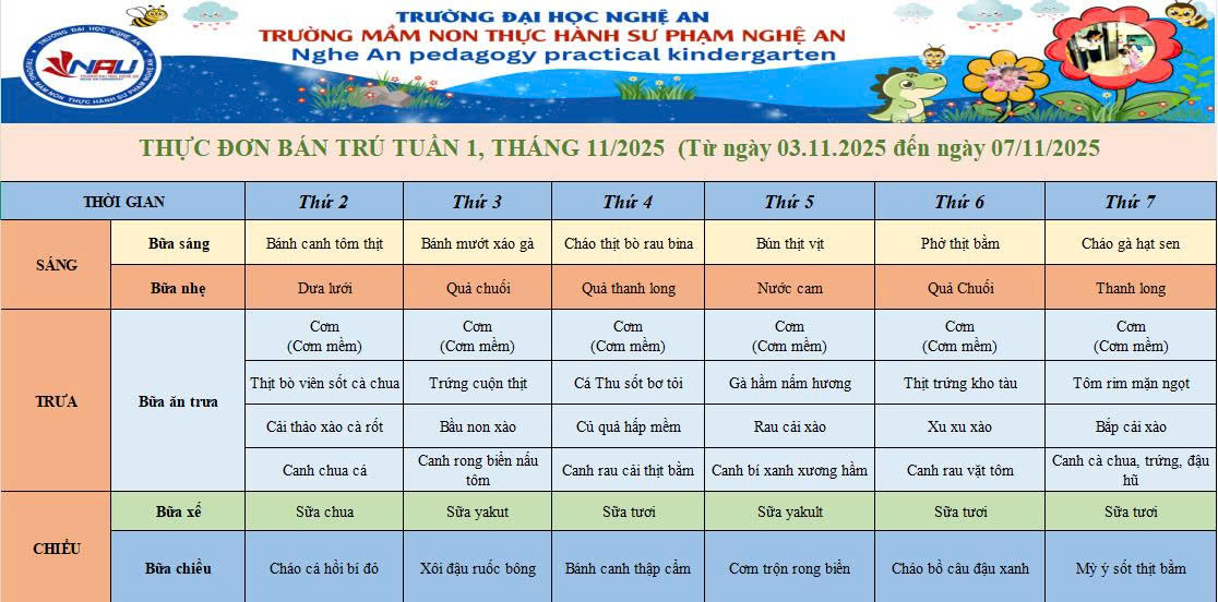 Trường Mầm non Thực hành Sư phạm Nghệ An xin gửi tới Quý phụ huynh thực đơn bán trú tuần 01 tháng 11/2025 (Từ ngày 03/11/2025 đến ngày 07/11/2025). Phụ huynh cùng xem thực đơn tuần này của con nhé – để cùng đồng hành, chăm sóc dinh dưỡng cho bé tại nhà thật hài hòa và khoa học ❤️