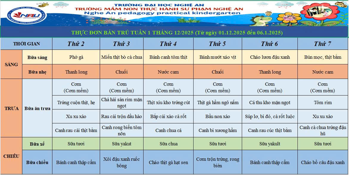 THỰC ĐƠN BÁN TRÚ – TUẦN 1, THÁNG 12/2025