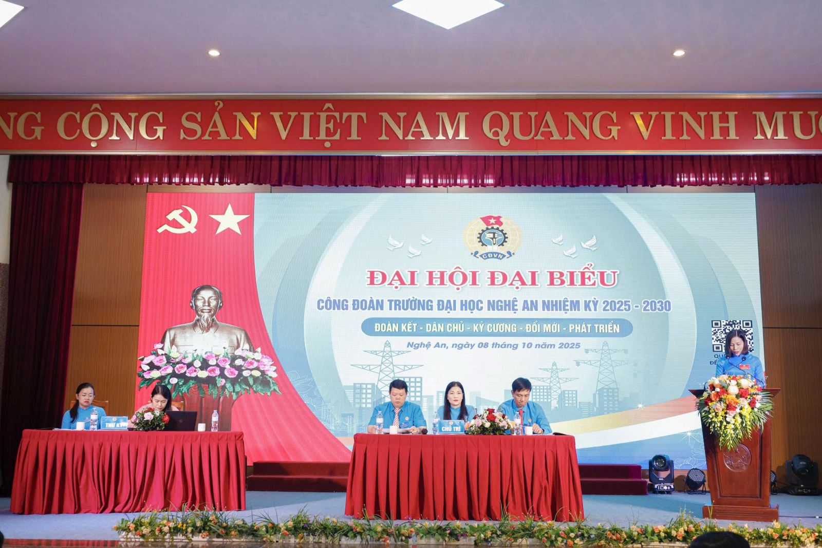 Ngày 08/10/2025, tại Hội trường A1 – Trường Đại học Nghệ An, Đại hội Công đoàn Trường Đại học Nghệ An lần thứ I, nhiệm kỳ 2025 – 2030 đã diễn ra trong không khí trang trọng, dân chủ, đoàn kết và đổi mới. Đây là sự kiện chính trị quan trọng, đánh dấu bước phát triển mới của tổ chức Công đoàn trong Nhà trường sau khi sáp nhập, góp phần đồng hành cùng sự phát triển của Trường Đại học Nghệ An trong giai đoạn mới.