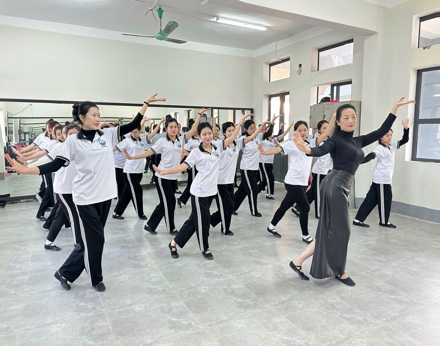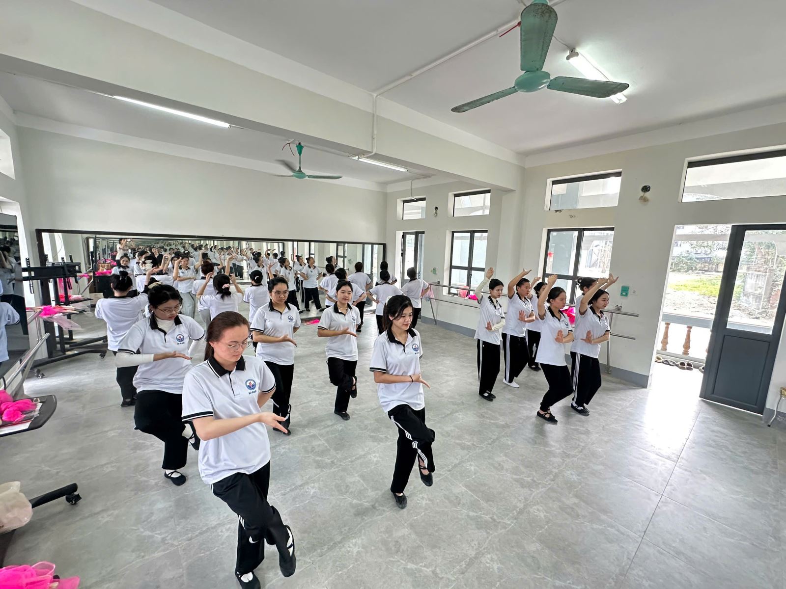 Hình ảnh ghi nhận tại giờ học đầu tuần của tập thể K46 cho thấy tinh thần học tập nghiêm túc và say mê. Những dải lụa hồng bay bổng trong không gian gương soi hiện đại không chỉ tạo nên một bức tranh đẹp, mà còn minh chứng cho sự nỗ lực không ngừng của các em trong việc hoàn thiện kỹ năng nghề nghiệp.