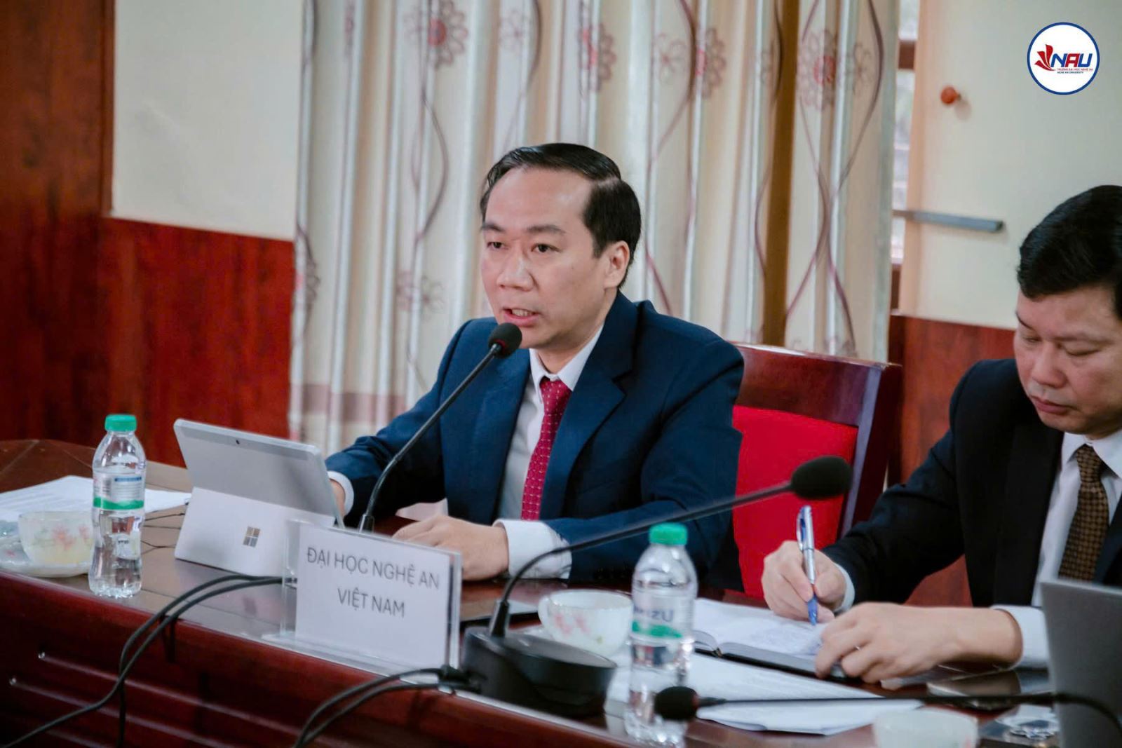 Buổi làm việc được tổ chức kết hợp 2 hình thức trực tuyến và trực tiếp, dưới sự đồng chủ trì của TS. Nguyễn Ngọc Hiếu – Hiệu trưởng Trường Đại học Nghệ An và TS. Tiêu Kiến Trang – Hiệu trưởng Trường Đại học Quảng Tây, cùng với sự tham gia của các đơn vị liên quan.
