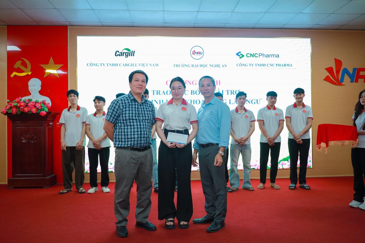 Đại diên Công ty TNHH CNC Pharma và Công ty TNHH Cargill Việt Nam trao học bổng cho sinh viên ngành Thú y Trường Đại học Nghệ An