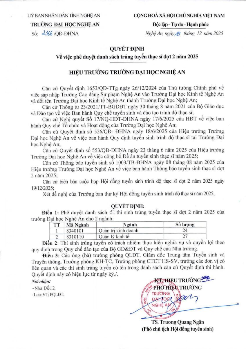 Quyết định về việc phê duyệt danh sách trúng tuyển Thạc sĩ đợt 2 năm 2025 19/12/2025 10:36 103 lượt xem