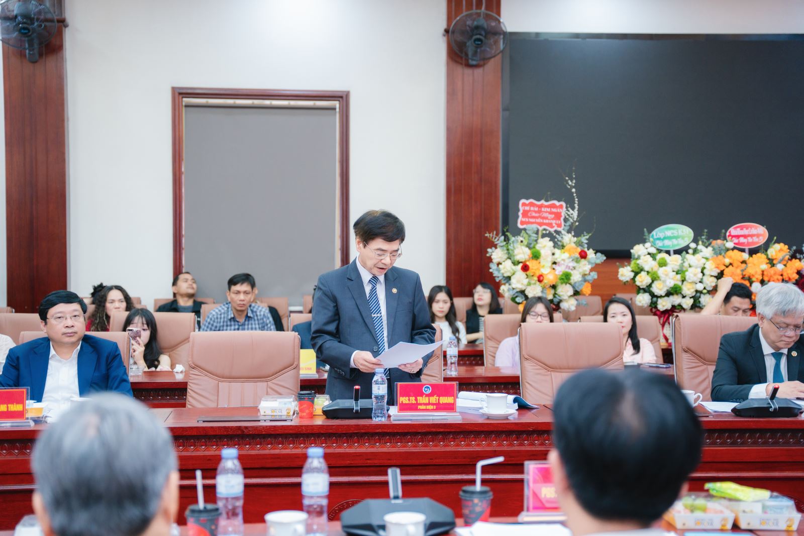 TS. Trương Quang Ngân - Phó Hiệu trưởng Trường Đại học Nghệ An phát biểu chúc mừng NCS Nguyễn Khánh Ly