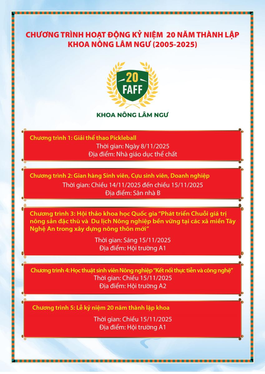 Chương trình hoạt động kỷ niệm 20 năm thành lập khoa Nông Lâm Ngư (2005 - 2025) 28/10/2025 11:41 74 lượt xem