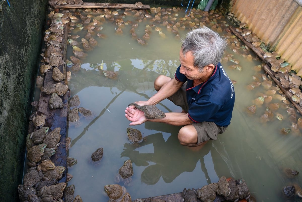 Ông Nguyễn Văn Khoa kiểm tra một con ếch cái giống.