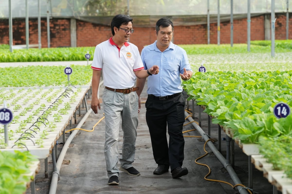 Chuyên gia nông nghiệp thăm và trò chuyện cùng anh Lâm Ngọc Tuấn, Chủ tịch HTX Rau thủy canh Tuấn Ngọc.