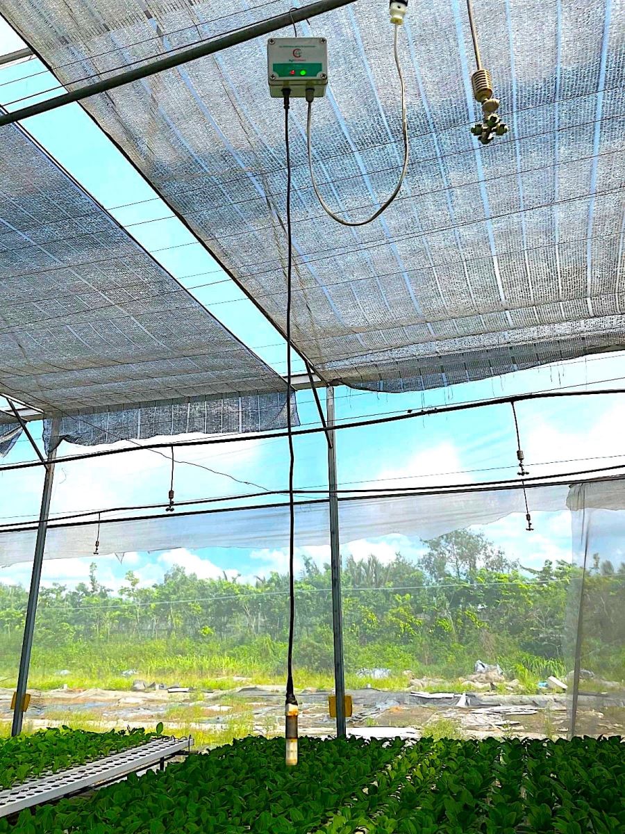 Cảm biến IoT trong nhà kính và nguyên lý hồi lưu kết hợp thủy canh tĩnh tại vườn rau của HTX Rau thủy canh Tuấn Ngọc.