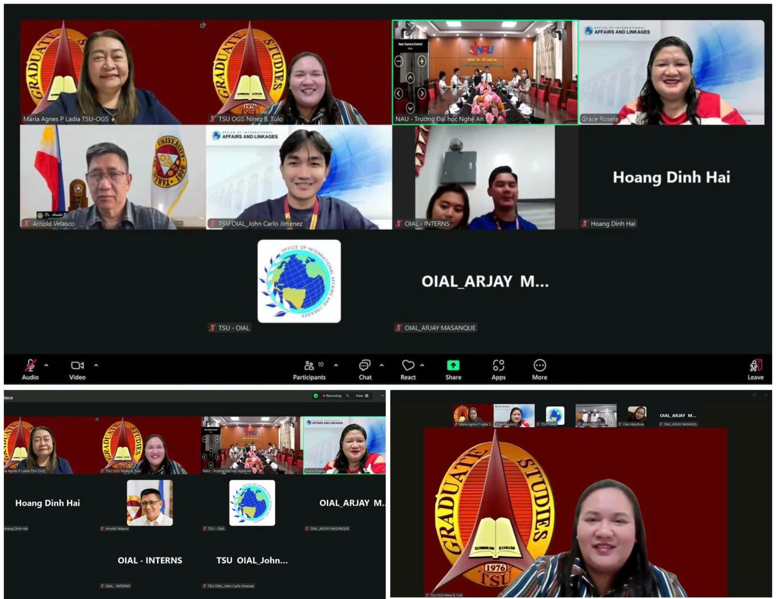 Toàn cảnh phiên làm việc trực tuyến qua nền tảng Zoom giữa Trường Đại học Nghệ An (NAU) và Trường Đại học Tarlac (TSU - Philippines)