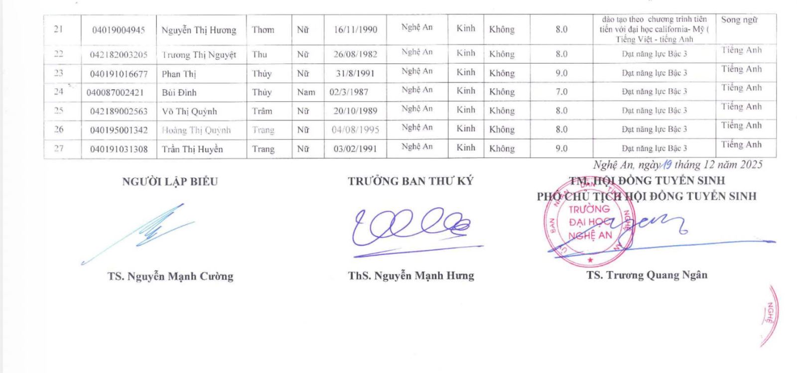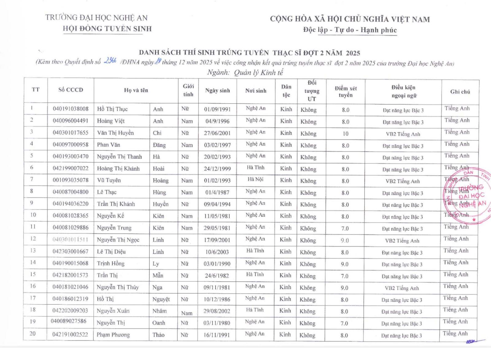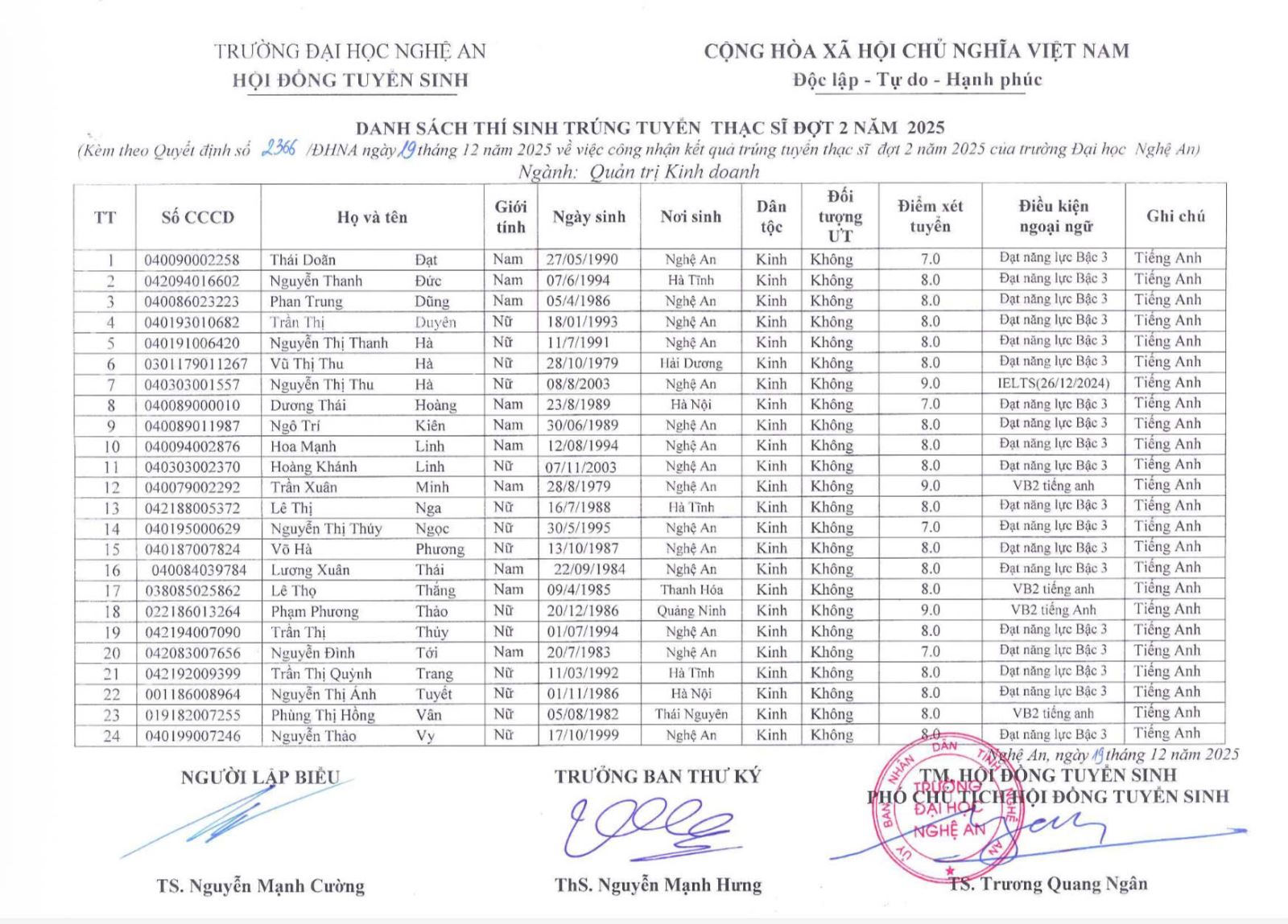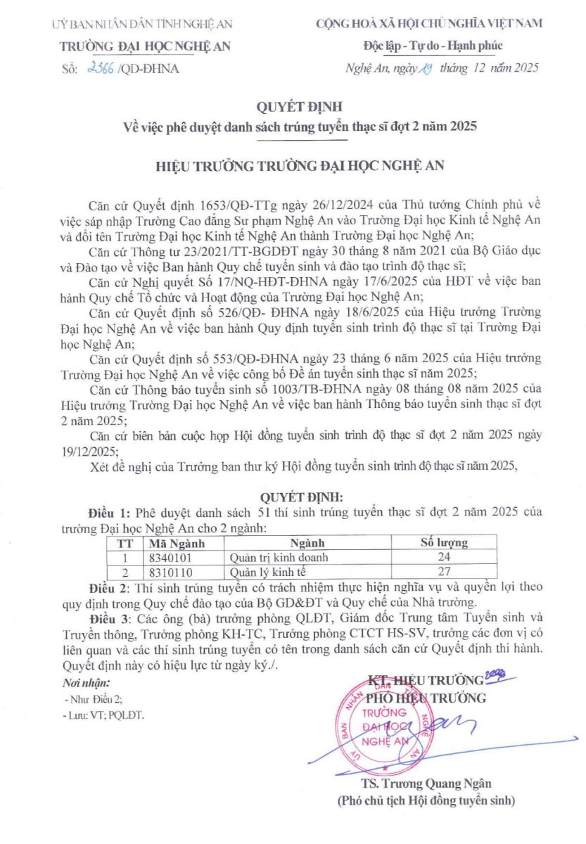 Quyết định về việc phê duyệt danh sách trúng tuyển Thạc sĩ đợt 2 năm 2025 19/12/2025 02:14 551 lượt xem