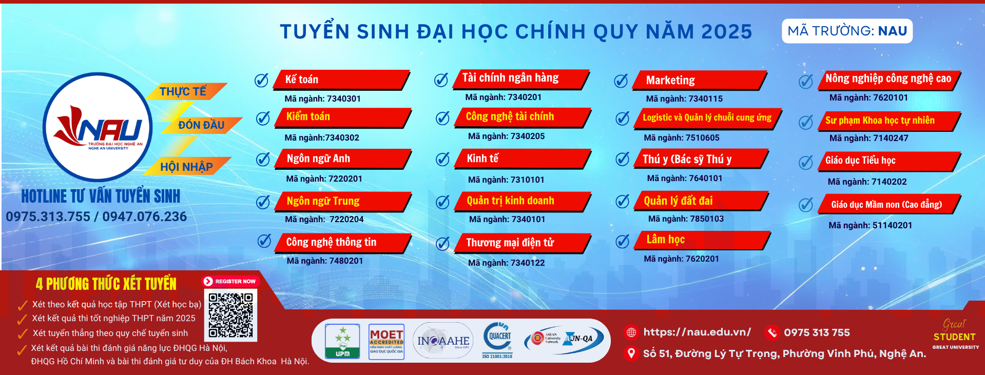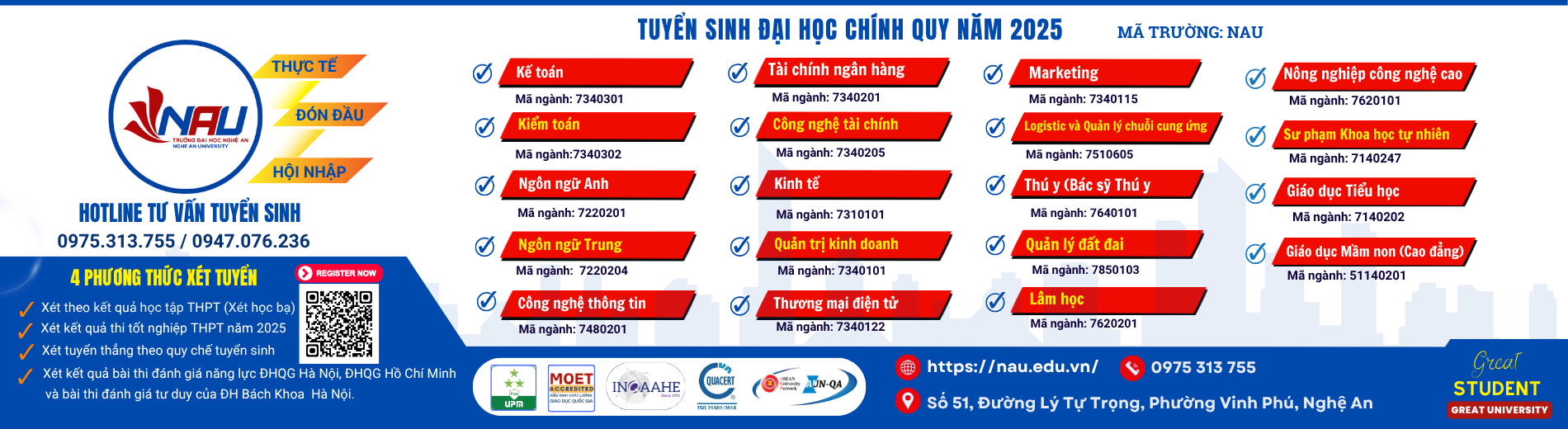 Trường Đại học Nghệ An không chỉ là một cơ sở giáo dục công lập chất lượng cao, mà còn là trung tâm sáng tạo và đổi mới, mang đến cho sinh viên môi trường học tập chuyên nghiệp, nhiều cảm hứng. Với mục tiêu là đào tạo nguồn nhân lực chất lượng cao, NAU không ngừng tìm kiếm những phương pháp đào tạo tiên tiến nhất, từ lý thuyết đến thực hành, để vươn tầm khu vực ASEAN và thế giới.