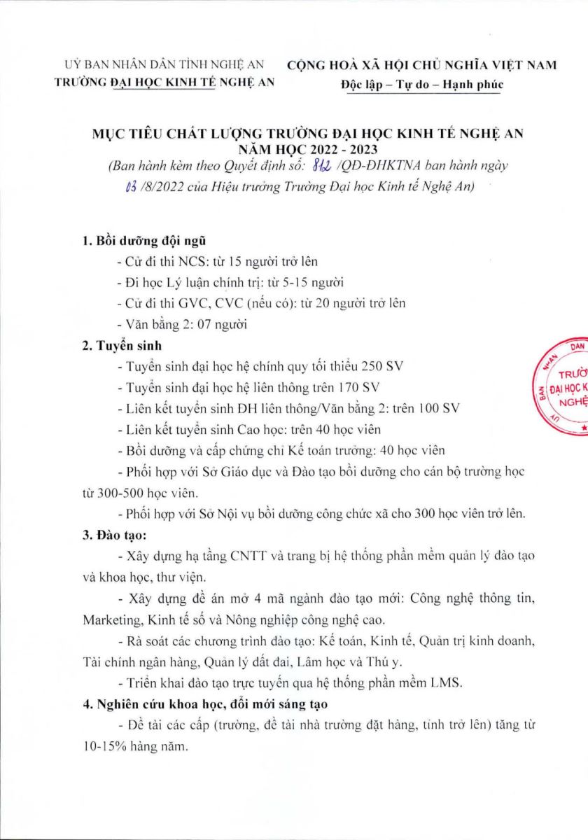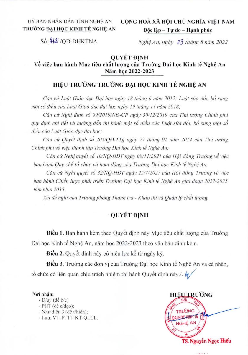 Quyết định ban hành Mục tiêu chất lượng của Trường Đại học Kinh tế Nghệ An năm học 2022-2023 03/08/2022 09:52 3048 lượt xem