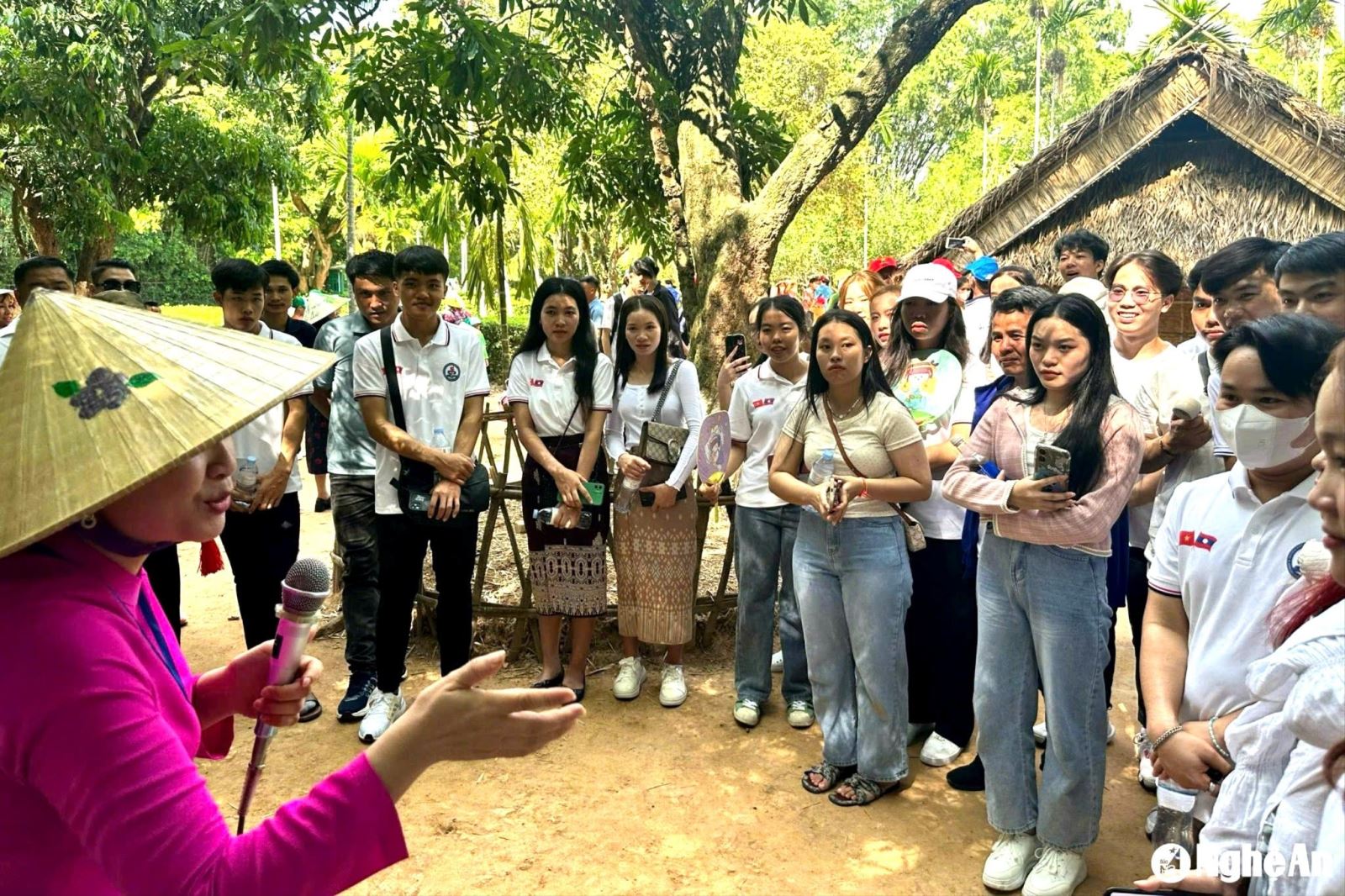 Các lưu học sinh Lào đi tham quan Khu di tích Kim Liên. Ảnh: NTCC