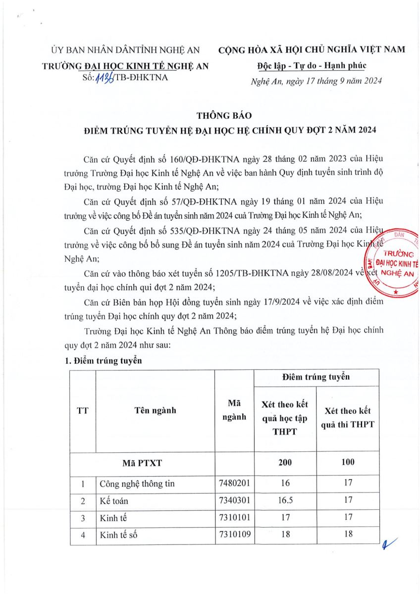 Thông báo Điểm trúng tuyển hệ đại học chính quy đợt 2 năm 2024