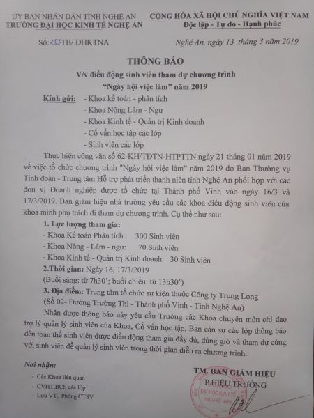 Thực hiện công văn số 253TB/ĐHKTNA ngày 13/3/2019 của trường Đại học Kinh tế Nghệ An về việc điều động sinh viên tham gia chương trình "Ngày hội việc làm" tỉnh Nghệ An năm 2019. Nay khoa Kế toán phân tích điều động sinh viên tham dự chương trình. Cụ thể như sau: