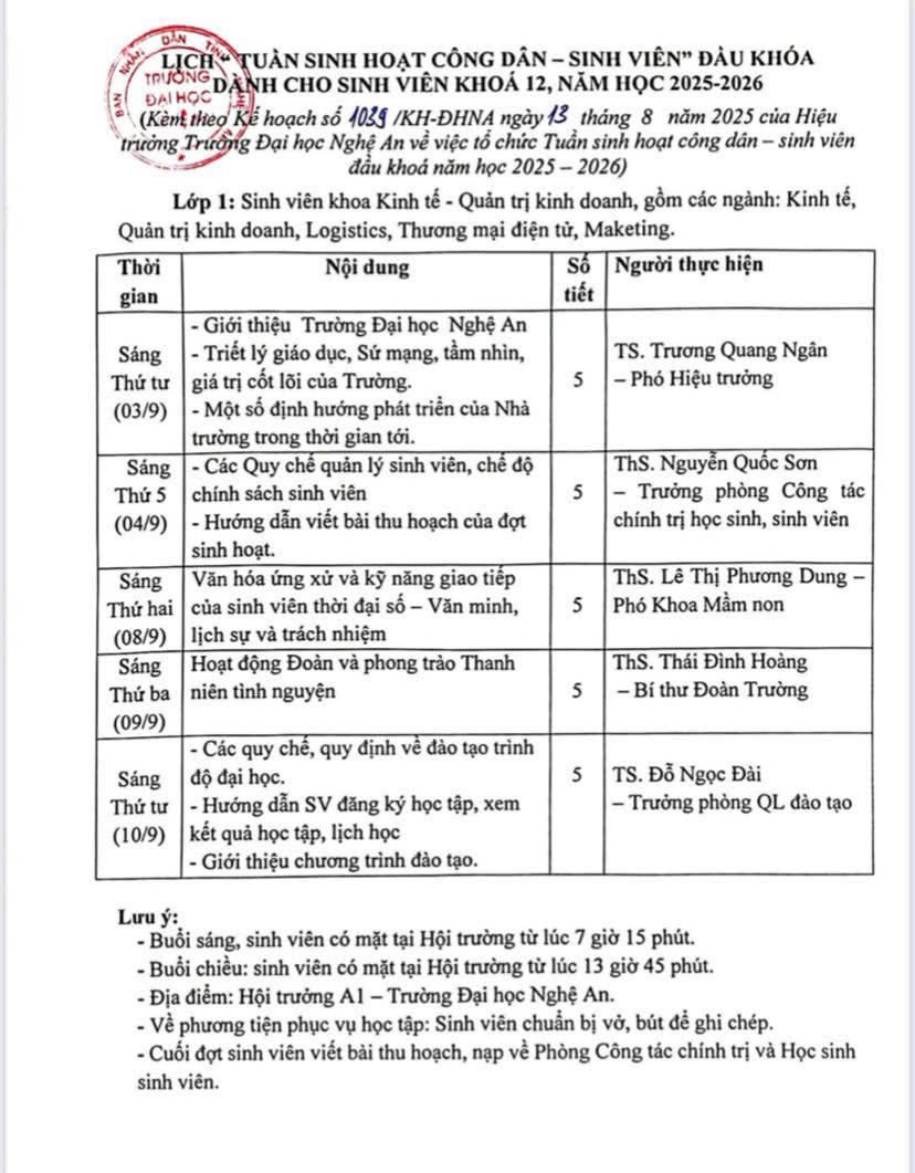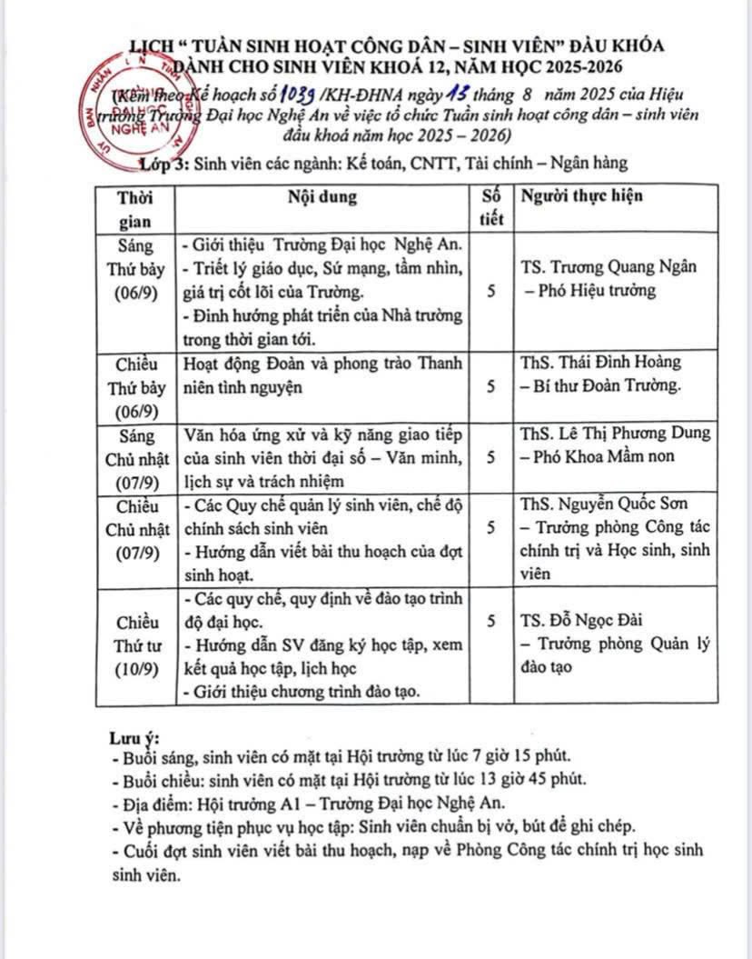 📌 Thời gian: từ 03/9 đến 10/9/2025 (theo lịch cụ thể cho từng lớp/ngành)