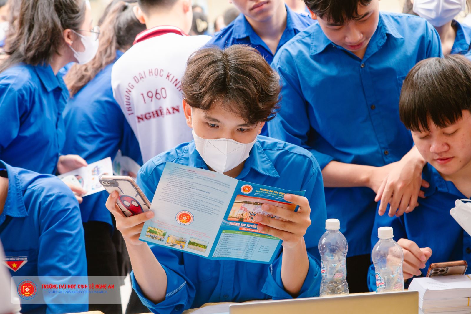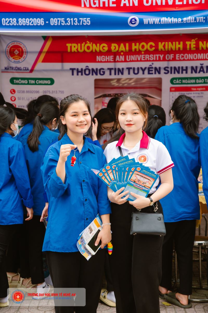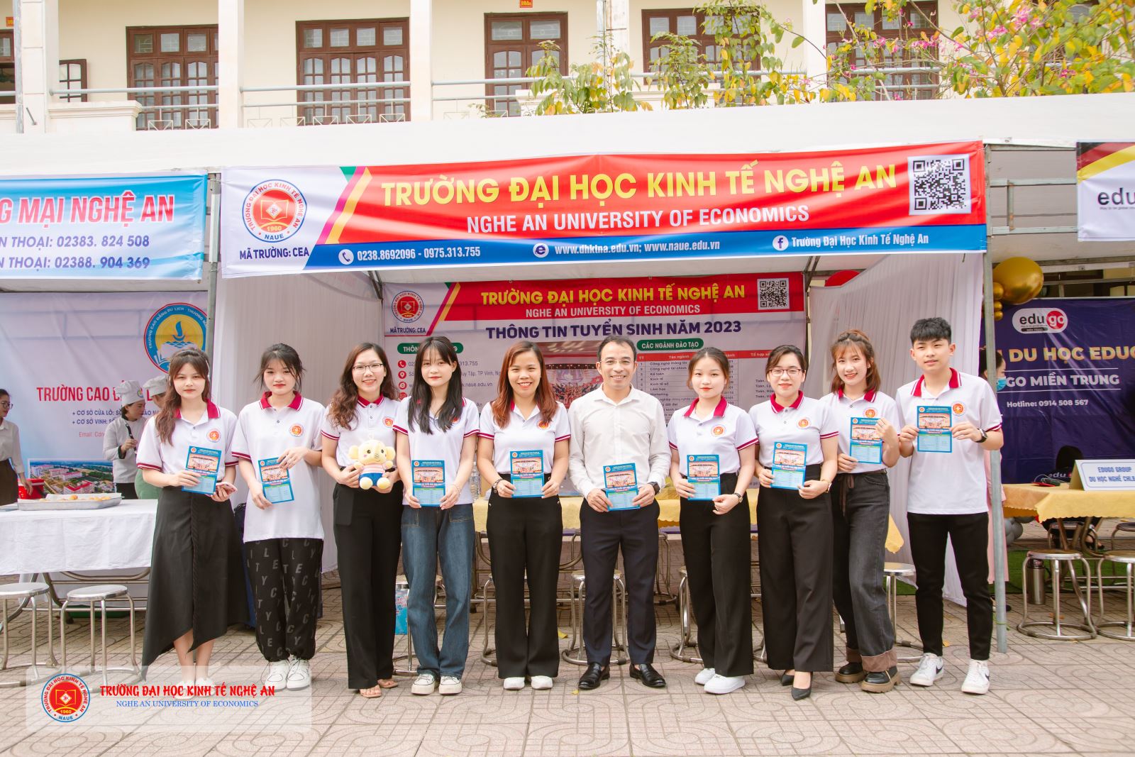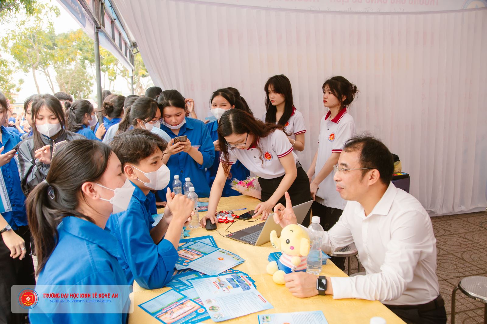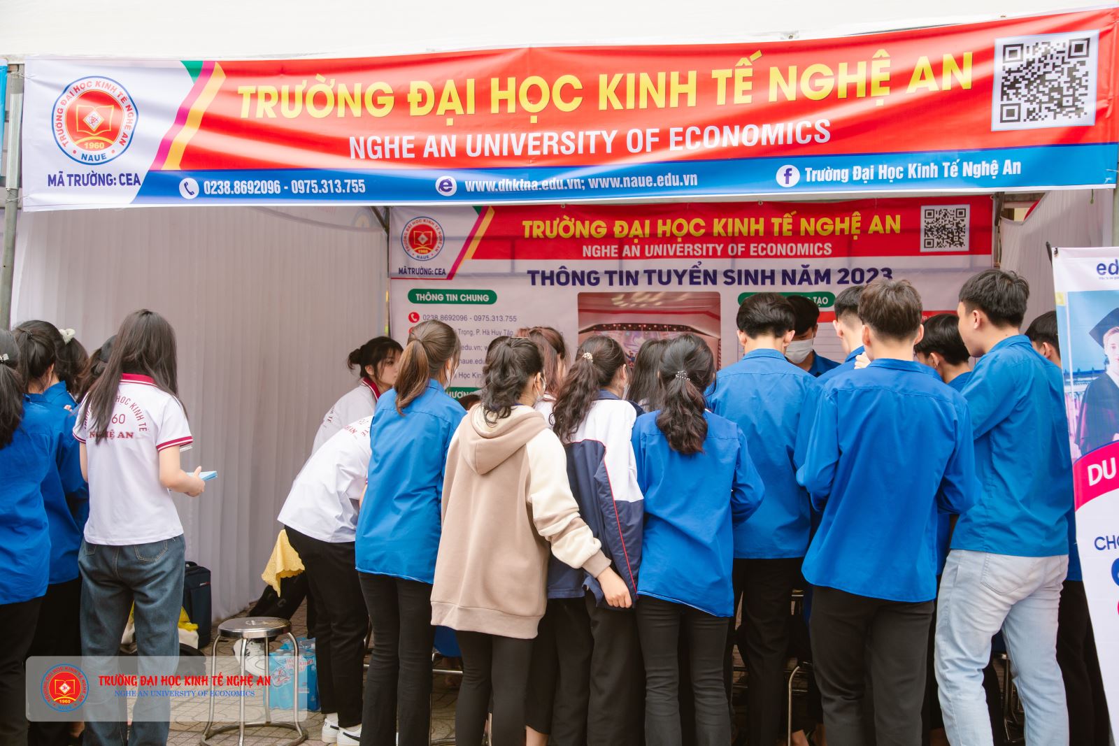 Gian hàng của Trường Đại học Kinh tế Nghệ An được trang trí bắt mắt với các nội dung quảng bá, tư vấn sẵn sàng phục vụ nhu cầu của học sinh. Tại đây, đại diện Trường Đại học Kinh tế Nghệ An đã chia sẽ về đối tượng, chỉ tiêu, phương thức tuyển sinh năm 2023, thời gian nhận hồ sơ và các chính sách ưu tiên của Nhà trường trong quá trình học tập tại trường đó là được miễn giảm học phí lên đến 100%, được nhận học bổng. Đặc biệt, Nhà trường còn có chương trình hỗ trợ sinh viên như cam kết giới thiệu việc làm trong nước cho sinh viên sau khi tốt nghiệp. Gian hàng ĐHKTNA đã tổ chức các chương trình chụp hình, trò chơi với nhiều phần quà hấp dẫn đã thu hút được đông đảo các bạn học sinh tham gia.