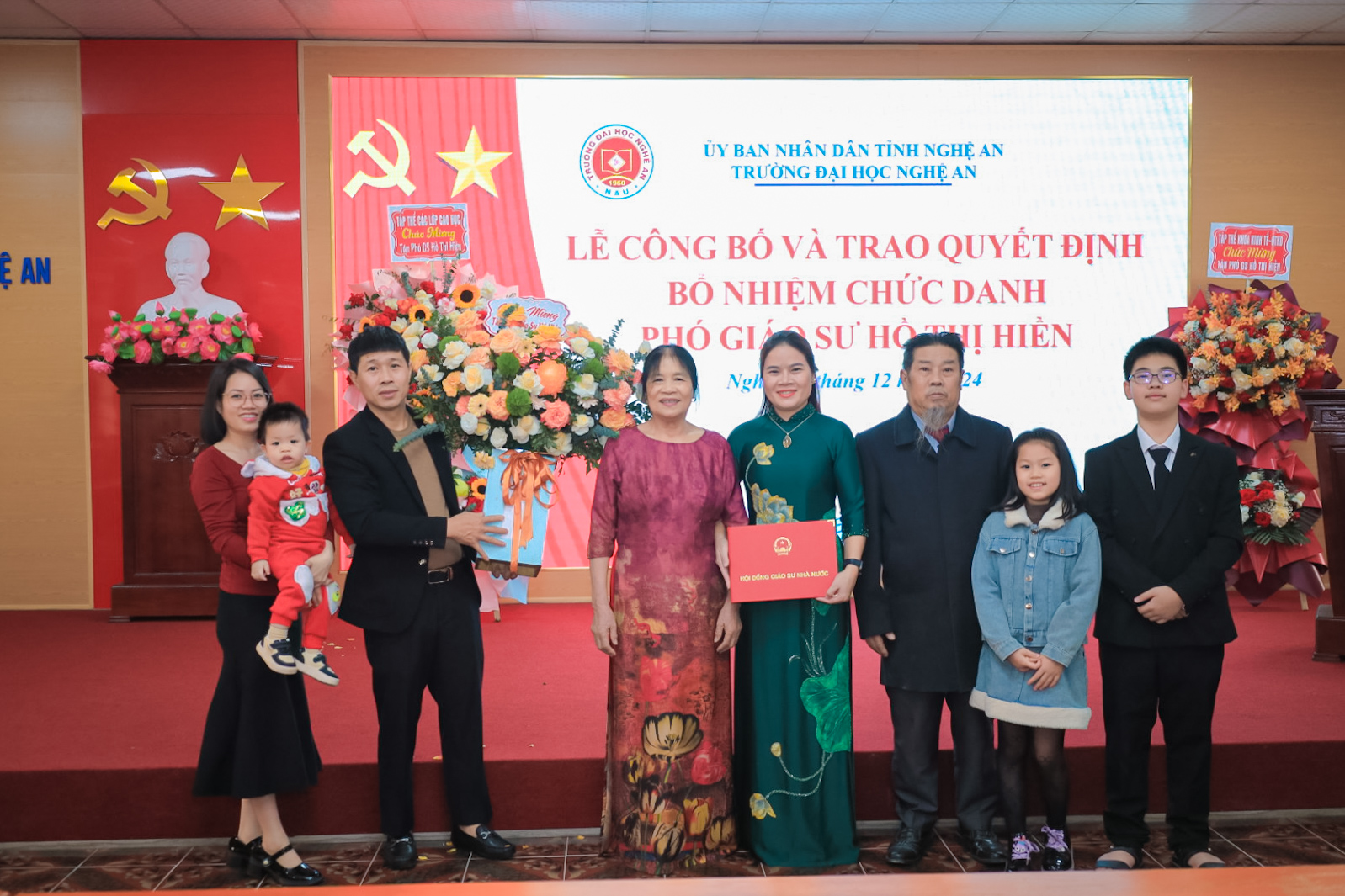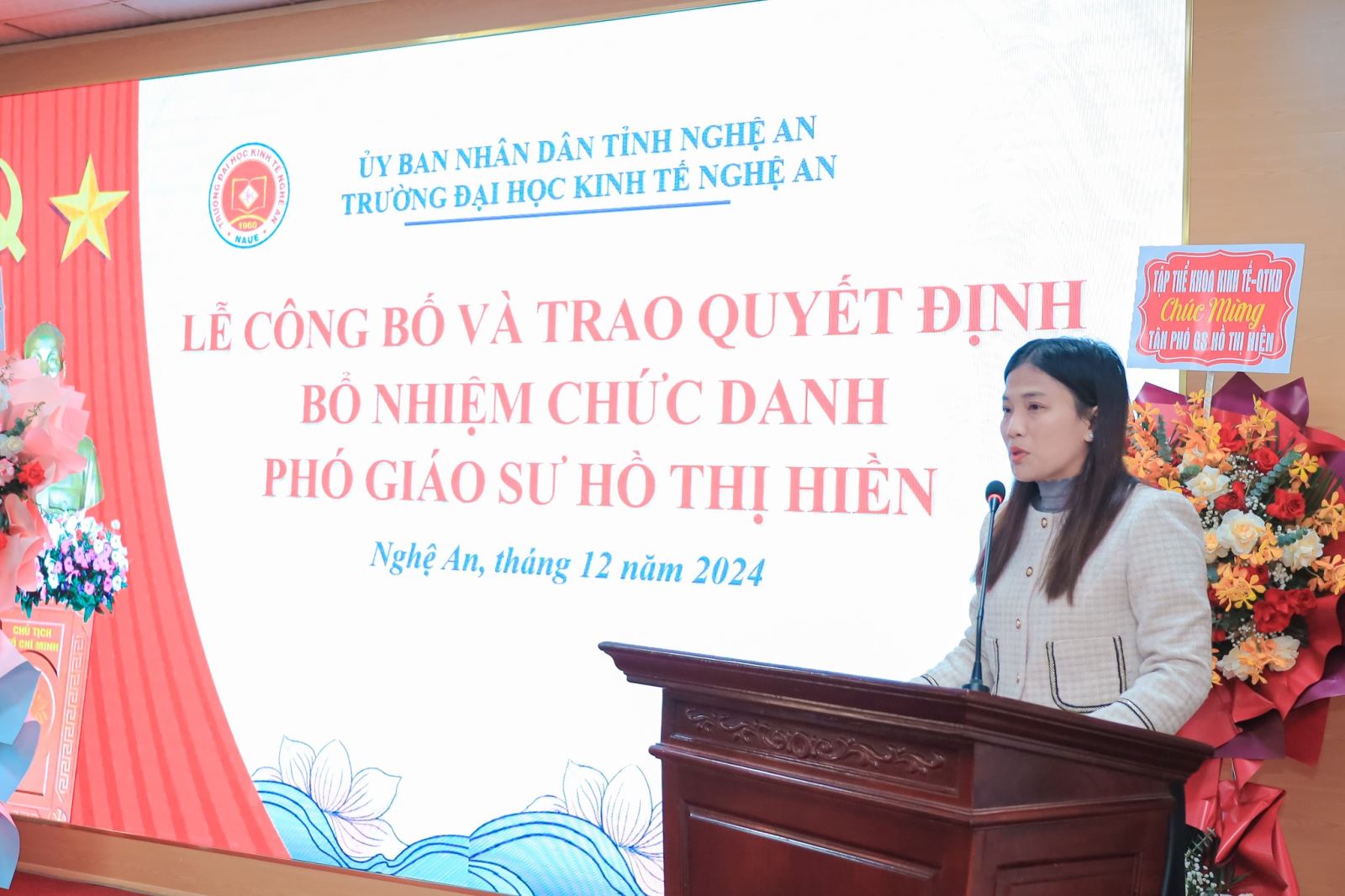 Tân PGS.TS Hồ Thị Hiền chia sẻ: Sự kiện hôm nay là không phải kết thúc của một chặng đường mà là bước khởi đầu để bản thân tiếp tục cố gắng, giảng dạy, công tác, nghiên cứu khoa học và dìu dắt các thế hệ học viên, sinh viên tiếp theo, góp phần vào sự phát triển chung của Trường Đại học Kinh tế Nghệ An (nay là Trường Đại học Nghệ An).
