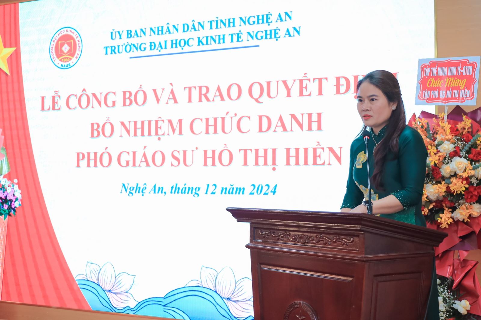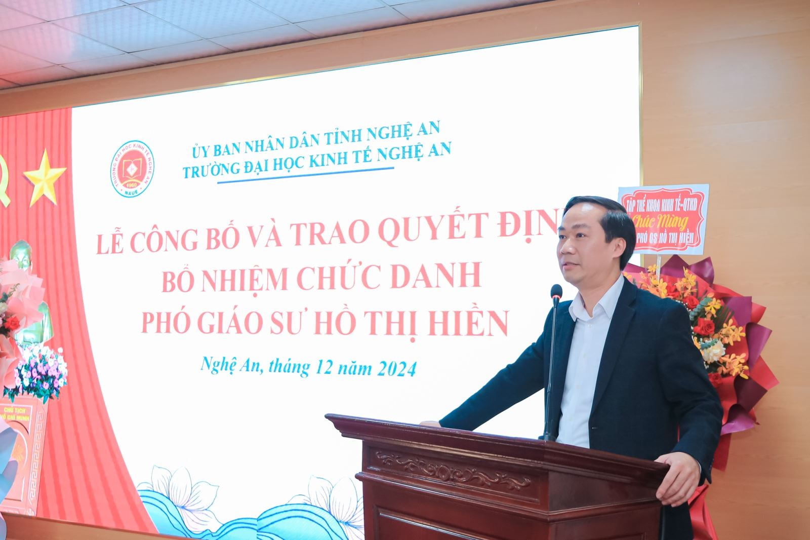 Thay mặt Ban lãnh đạo, TS. Nguyễn Ngọc Hiếu - Hiệu trưởng Nhà trường phát biểu, chúc mừng TS. Hồ Thị Hiền đã được Hội đồng Giáo sư Nhà nước công nhận đạt tiêu chuẩn chức danh Phó Giáo sư. Đây là sự kiện cuối cùng của năm 2024, là sự kiện rất quan trọng và có ý nghĩa đối với Nhà trường. Đồng chí Hiệu trưởng Nhà trường tin tưởng rằng với cương vị mới này, PGS. TS Hồ Thị Hiền sẽ tiếp tục cống hiến xây dựng hình ảnh Trường ĐH Kinh tế Nghệ An (nay là Trường Đại học Nghệ An) là một cơ sở đào tạo uy tín hàng đầu với đội ngũ giảng viên trình độ cao, hoàn thiện để đảm bảo chất lượng đào tạo trong cộng đồng học thuật trong nước và quốc tế.