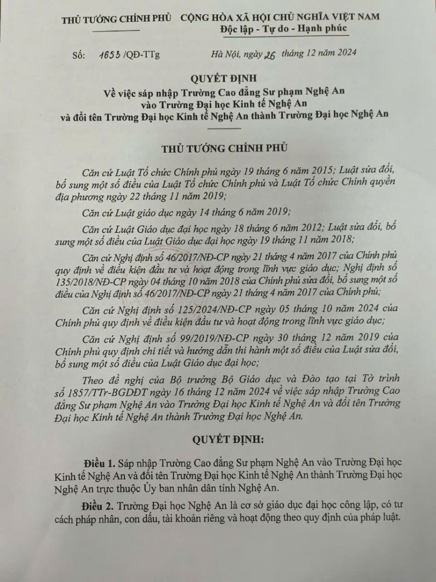 Ngày 26/12/2024, Chính phủ đã chính thức ban hành Quyết định quan trọng về việc sáp nhập Trường Cao đẳng Sư phạm Nghệ An vào Trường Đại học Kinh tế Nghệ An, đồng thời đổi tên Trường Đại học Kinh tế Nghệ An thành Trường Đại học Nghệ An. Đây là một Quyết định mang tính chiến lược, phản ánh sự đổi mới mạnh mẽ của hệ thống giáo dục trong bối cảnh hiện nay.