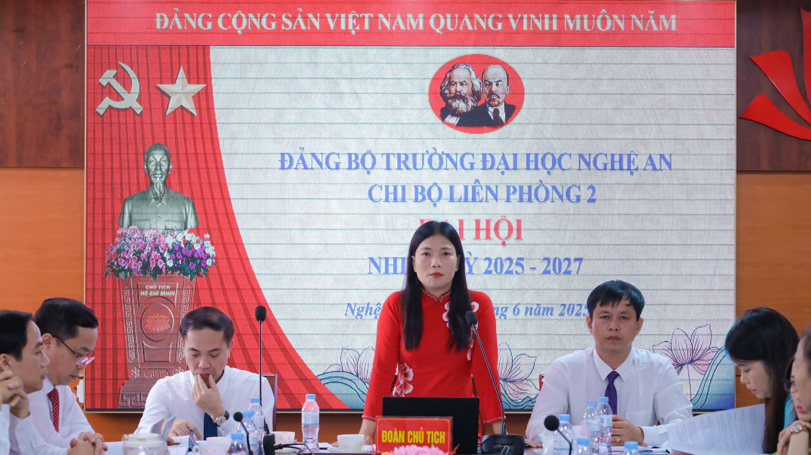 Sáng ngày 07 tháng 6 năm 2025, tại Phòng họp A1.2, Chi bộ Liên phòng 2 thuộc Đảng bộ Trường Đại học Nghệ An đã long trọng tổ chức Đại hội Chi bộ nhiệm kỳ 2025-2027. Đại hội là sự kiện chính trị quan trọng, tổng kết những thành quả đã đạt được trong nhiệm kỳ vừa qua và đề ra phương hướng, nhiệm vụ cho giai đoạn phát triển mới, đặc biệt trong bối cảnh sau sáp nhập các đơn vị.