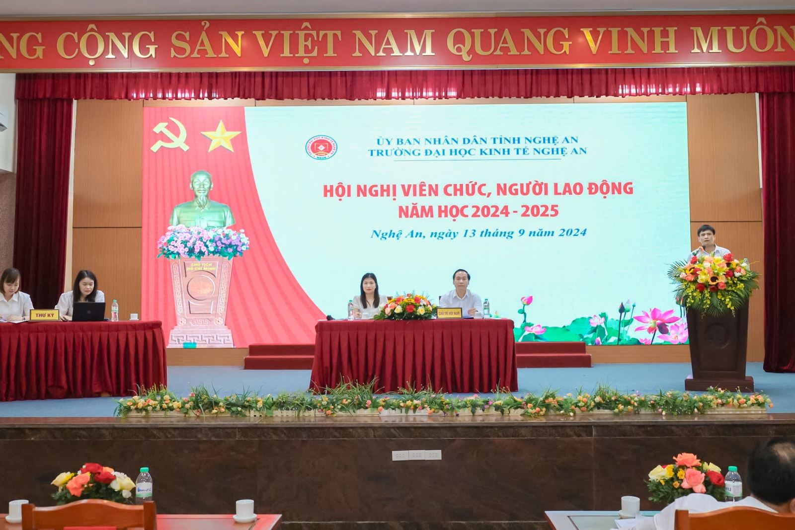 Kết thúc Hội nghị, TS. Nguyễn Ngọc Hiếu - Hiệu trưởng Nhà trường đã phát động phong trào thi đua năm học 2023-2024. Đồng chí kêu gọi toàn thể CBVC đang công tác tại mọi vị trí trong Trường tiếp tục phát huy truyền thống đoàn kết, năng động, sáng tạo, nghiêm túc để hoàn thành tốt các nhiệm vụ được giao; nêu cao tinh thần, thái độ tích cực để góp phần cùng Nhà trường hoàn thành tốt kế hoạch công tác và nhiệm vụ chính trị năm học 2024-2025, tiếp tục phát triển vững mạnh trong những năm tiếp theo. Tin tưởng rằng, với sự lãnh đạo của Đảng ủy, sự giám sát của Hội đồng trường, cùng sự đoàn kết, cố gắng của tập thể cán bộ viên chức trong toàn Trường, chắc chắn Trường Đại học Kinh tế Nghệ An sẽ vượt qua được những khó khăn và thách thức trước mắt để tiếp tục phát triển.