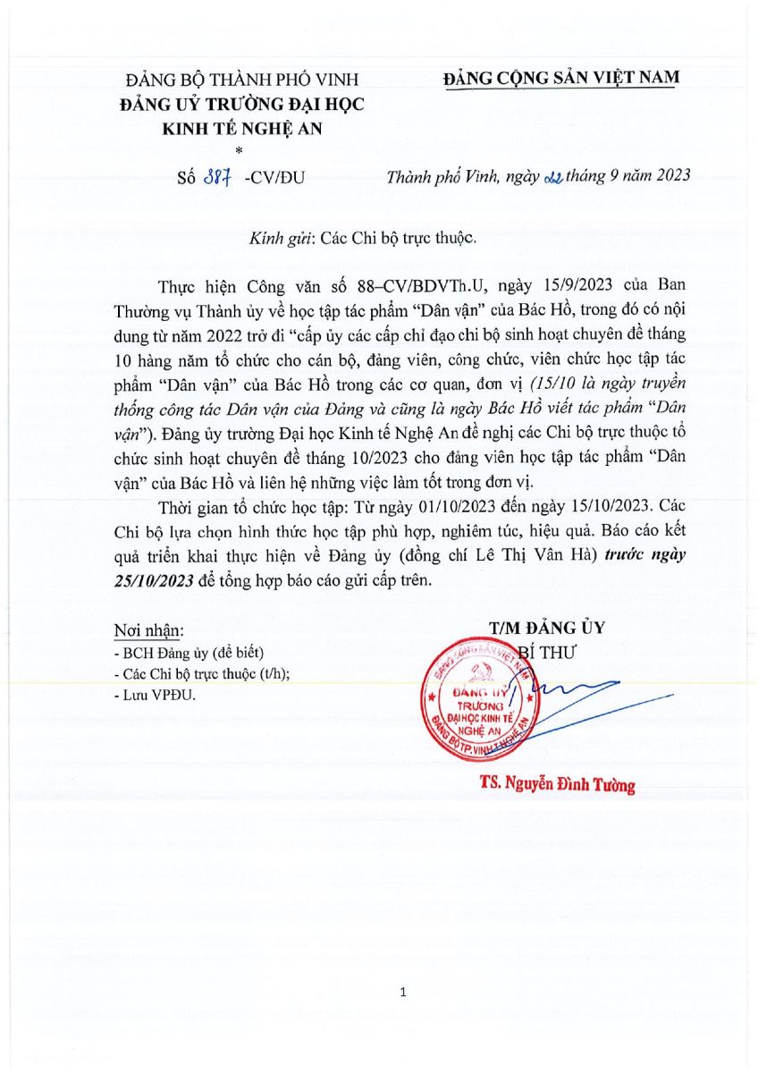 Thực hiện Công văn số 88-CV/BDVTh.U, ngày 15/9/2023 của Ba Thường vụ Thành ủy về học tập tác phẩm “Dân vận” của Bác Hồ, trong đó có ng dung từ năm 2022 trở đi “cấp ủy các cấp chỉ đạo chi bộ sinh hoạt chuyên đề tháng 10 hàng năm tổ chức cho cán bộ, đảng viên, công chức, viên chức học tập tác phẩm “Dân vận” của Bác Hồ trong các cơ quan, đơn vị (15/10 là ngày truyền thống công tác Dân vận của Đảng và cũng là ngày Bác Hồ viết tác phẩm “Dân vận"). Đảng ủy trường Đại học Kinh tế Nghệ An đề nghị các Chi bộ trực thuộc tổ chức sinh hoạt chuyên đề tháng 10/2023 cho đảng viên học tập tác phẩm “Dân vận" của Bác Hồ và liên hệ những việc làm tốt trong đơn vị. Cụ thể như sau: