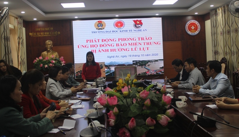 Ngày 19/10/2020, Công đoàn Trường Đại học Kinh tế Nghệ An phối hợp với Đoàn thanh niên đã phát động phong trào ủng hộ đồng bào miền Trung bị lũ lụt đến hơn 170 cán bộ, giảng viên, công nhân viên chức trong toàn Trường đã trực tiếp quyên góp hơn 25 triệu đồng; số tiền của cán bộ, giảng viên, công nhân viên, sinh viên của toàn Trường ủng hộ Nhân dân các tỉnh miền Trung bị thiệt hại do thiên tai lũ lụt tuy không lớn, nhưng là tấm lòng tương thân tương ái, giúp đỡ bà con lúc khó khăn hoạn nạn.