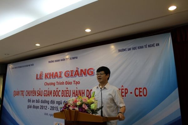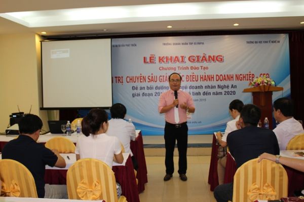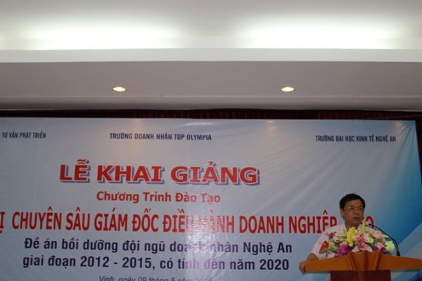 Nhằm mục đích bồi dưỡng đội ngũ doanh nhân Nghệ An nói chung và trên địa bàn thành phố Vinh nói riêng về các kiến thức cơ bản về Quản trị kinh doanh, quản trị nhân sự, Văn hóa doanh nghiệp và các kỹ năng mềm khác nhằm đáp ứng yêu cầu phát triển và hội nhập khu vực và thế giới. Bồi dưỡng đội ngũ doanh nhân đủ năng lực, có trình độ, khả năng quản lý và điều hành doanh nghiệp, nâng cao năng lực cạnh tranh cho các doanh nghiệp, sáng ngày 09 tháng 5 năm 2015 tại Khách sạn Beijing, thành phố Vinh, Trường Đại học Kinh tế Nghệ An phối hơp với Trung tâm xúc tiến đầu tư và tư vấn phát triển -  Sở Kế hoạch đầu tư và trường Đào tạo doanh nhân top Olimpia tổ chức khai giảng chương trình đào tạo Quản trị chuyên sâu giám đốc điều hành doanh nghiệp – CEO cho đội ngũ doanh nhân Nghệ An.