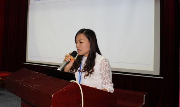 Cô giáo Phan Thanh Bình - giáo viên khoa Cơ sở đại diện cho 23 thí sinh dự thi phát biểu tại lễ khai mạc hội thi