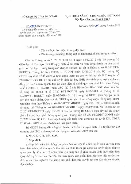 Công văn 2969 hướng dẫn thanh tra, kiểm tra tuyển sinh đại học, tuyển sinh CĐ và TC nhóm ngành đào tạo giáo viên năm 2019 16/07/2019 09:40 8104 lượt xem Download văn bản tại đây.