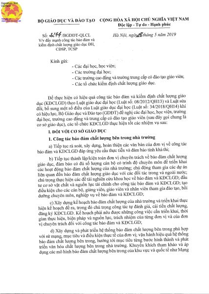 Công văn số 2274/BGDĐT-QLCL về việc đẩy mạnh công tác đảm bảo và kiểm đinh chất lượng giáo dục ĐH, CĐSP và TCSP 21/06/2019 04:21 8664 lượt xem
