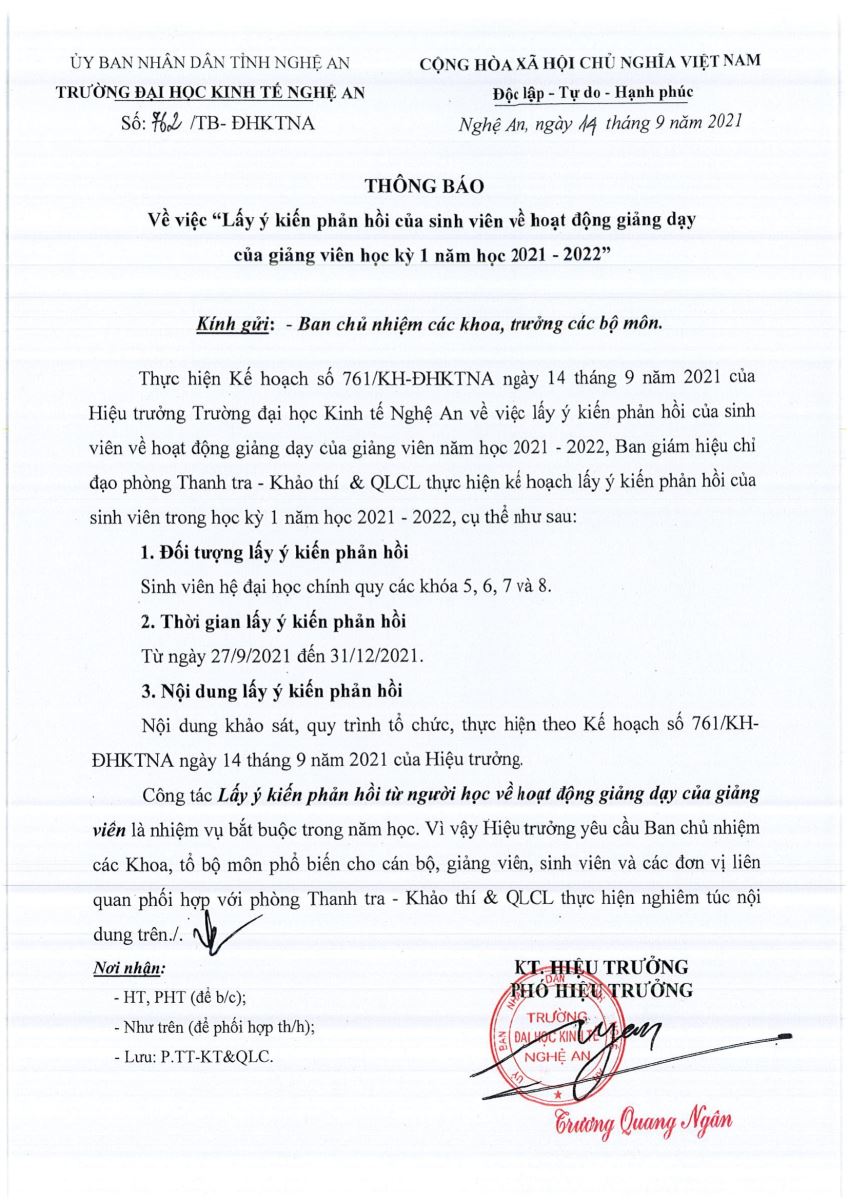 Thông báo về việc lấy ý kiến phản hồi của sinh viên về hoạt động giảng dạy của giảng viên học kỳ 1 năm học 2021-2022 21/09/2021 10:45 5922 lượt xem