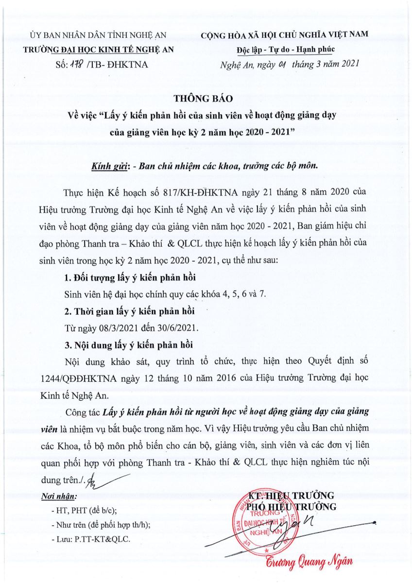 Thông báo v/v lấy ý kiến khảo sát hoạt động giảng dạy của giảng viên kỳ 2, năm học 2020 - 2021 02/03/2021 05:13 7779 lượt xem