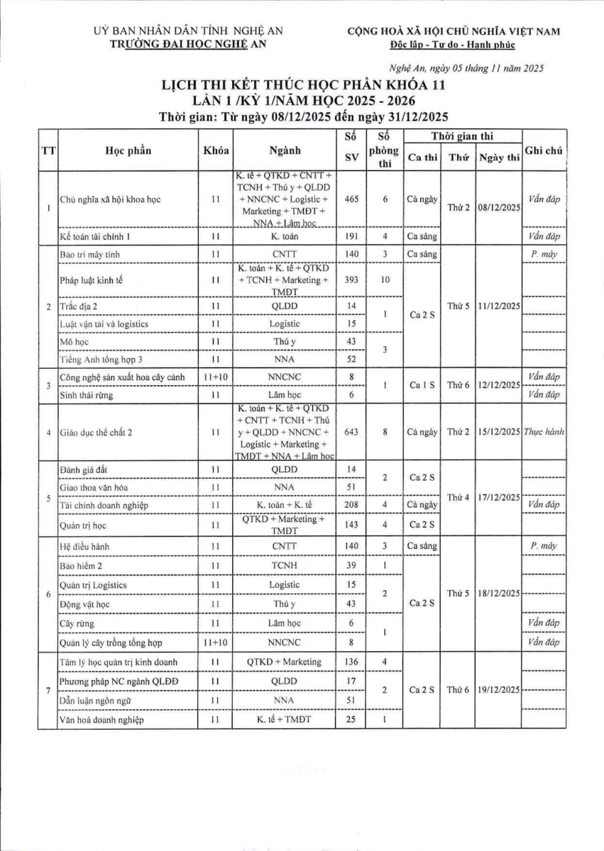 Lịch thi HK1 2025-2026 hệ Liên thông, Văn bằng 2, Vừa học vừa làm