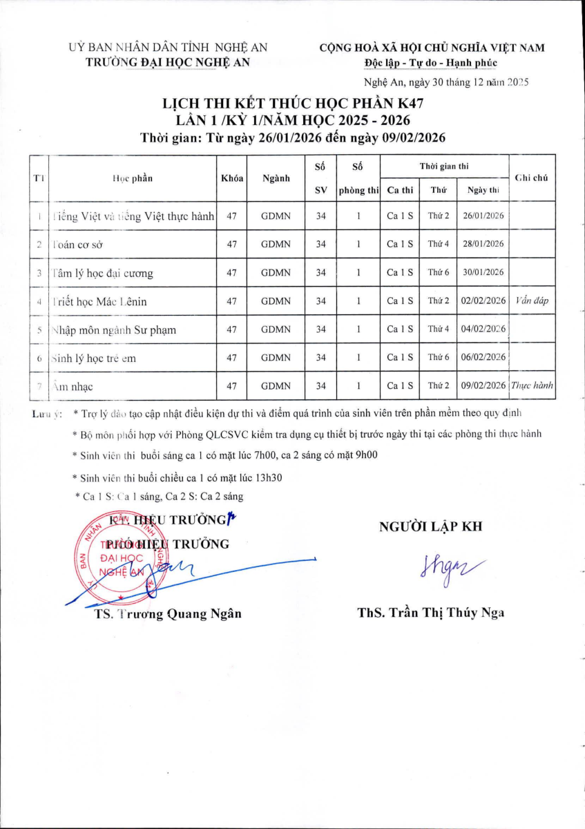 Lịch thi kết thúc học phần K47 Giáo dục mầm non và K12 Giáo dục tiểu học - Lần 1/Kỳ 1 năm 2025-2026 30/12/2025 09:05 276 lượt xem