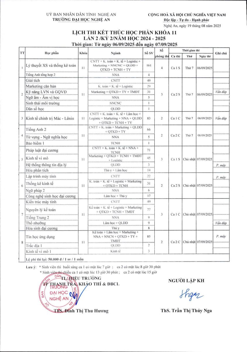Lịch thi kết thúc học phần Khóa 9 học lại và lần 2, kỳ 2, năm học 2024-2025