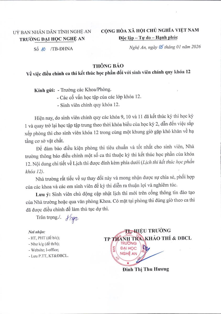 Thông báo điều chỉnh lịch thi kết thúc học phần Hệ Đại học Chính quy Khóa 12 06/01/2026 10:25 503 lượt xem