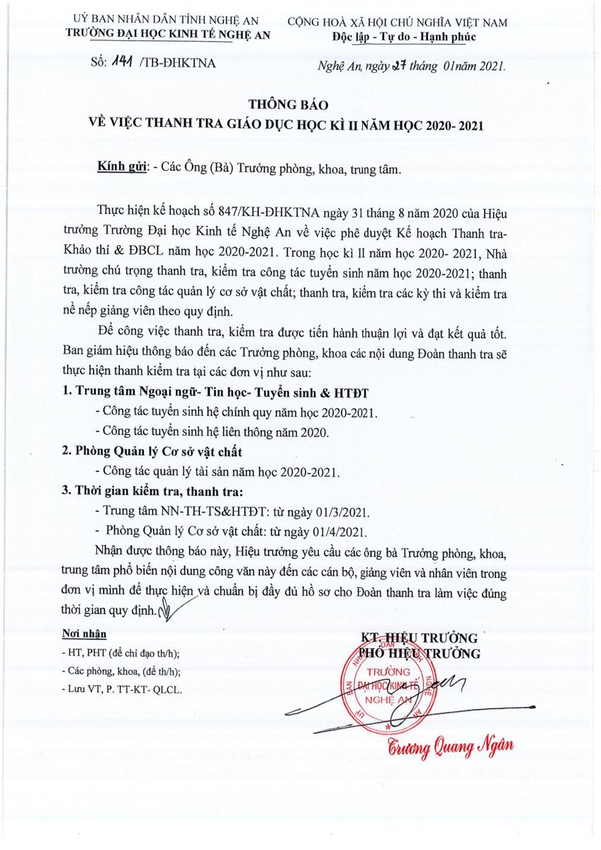 Thông báo về việc thanh tra giáo dục HK1 năm học 2020-2021