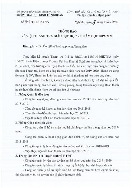 Thông báo về việc thanh tra giáo dục học kỳ I năm học 2019-2020 26/09/2019 08:50 8304 lượt xem Dowload tại đây: Tin: Phòng Thanh tra - Khảo thí và Quản lý chất lượng.