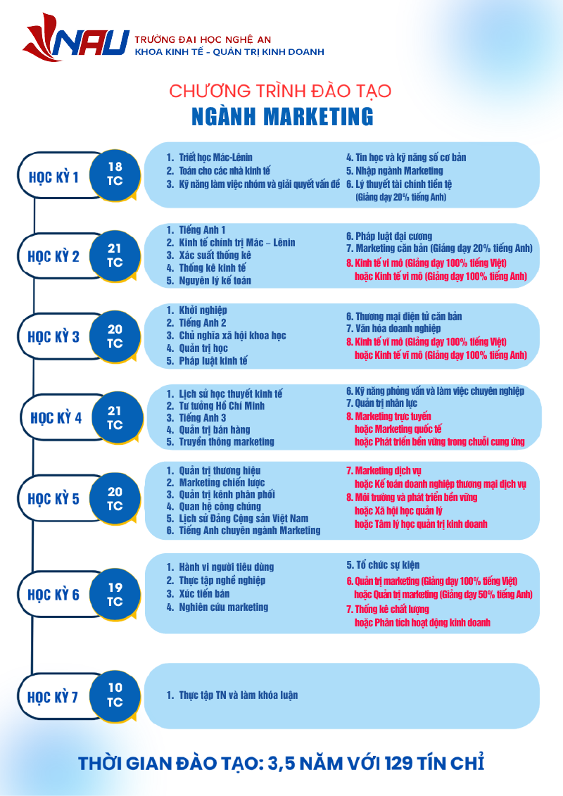 Chương trình đào tạo ngành Marketing (Mã ngành: 7340115) tại Trường Đại học Nghệ An được thiết kế theo định hướng ứng dụng, bám sát Chuẩn đầu ra Khung trình độ quốc gia Việt Nam, đồng thời cập nhật các xu hướng hiện đại trong lĩnh vực truyền thông – thương hiệu – hành vi tiêu dùng.
