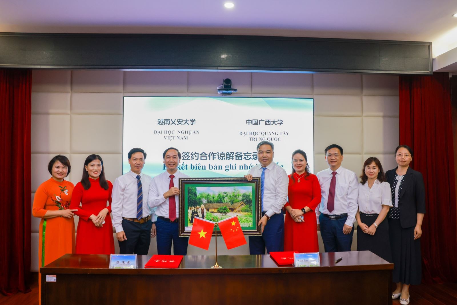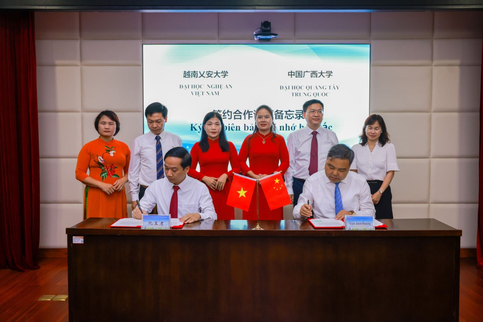 Buổi lễ ký kết có sự hiện diện của Tiến sĩ Nguyễn Ngọc Hiếu – Hiệu trưởng Trường Đại học Nghệ An, cùng đoàn công tác cấp cao. Về phía đối tác, đại diện Đại học Quảng Tây có Giáo sư, Tiến sĩ Tiêu Kiến Trang – Phó Hiệu trưởng, cùng các lãnh đạo đơn vị chuyên môn tham dự. Hai bên đã thống nhất định hướng hợp tác trong các lĩnh vực: trao đổi sinh viên, giảng viên; đồng tổ chức hội thảo quốc tế; hợp tác nghiên cứu khoa học và đào tạo song phương.