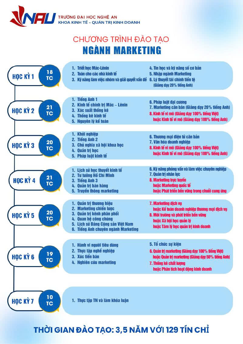 Với hệ thống học phần được thiết kế hợp lý, linh hoạt giữa học thuật và ứng dụng thực tiễn, cùng định hướng quốc tế hóa rõ rệt, Chương trình đào tạo ngành Marketing năm 2025 của Trường Đại học Nghệ An không chỉ giúp sinh viên nắm vững kiến thức chuyên môn mà còn phát triển năng lực ngoại ngữ – một trong những yếu tố then chốt giúp họ sẵn sàng bước vào môi trường làm việc toàn cầu hóa.