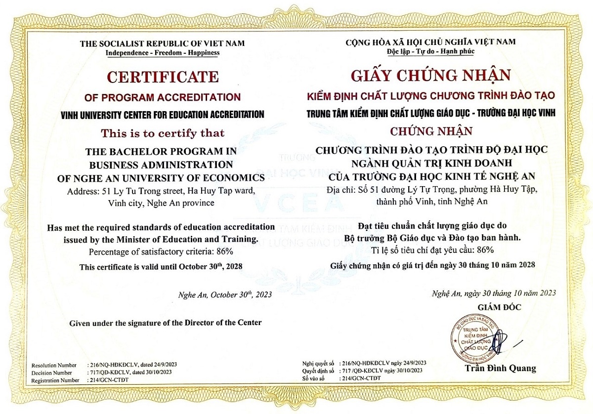 Chương trình đào tạo ngành Quản trị Kinh doanh tại Trường Đại học Kinh tế Nghệ An được thiết kế để trang bị cho sinh viên những kiến thức và kỹ năng cần thiết để quản lý và vận hành doanh nghiệp hiệu quả. Chương trình học ngành này thường bao gồm các môn học căn bản như Kinh tế vi mô, vĩ mô, Nguyên lý kế toán, Lý thuyết tài chính tiền tề, Quản trị Tài chính doanh nghiệp, Quản trị Marketing, Quản trị Nhân sự, Quản lý chuỗi cung ứng và logistics, Quản trị Chiến lược ... Với mục tiêu đào tạo nguồn nhân lực chất lượng cao, chương trình này nhấn mạnh vào việc phát triển khả năng quản lý, tư duy sáng tạo và năng lực kinh doanh của sinh viên.