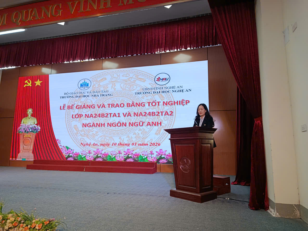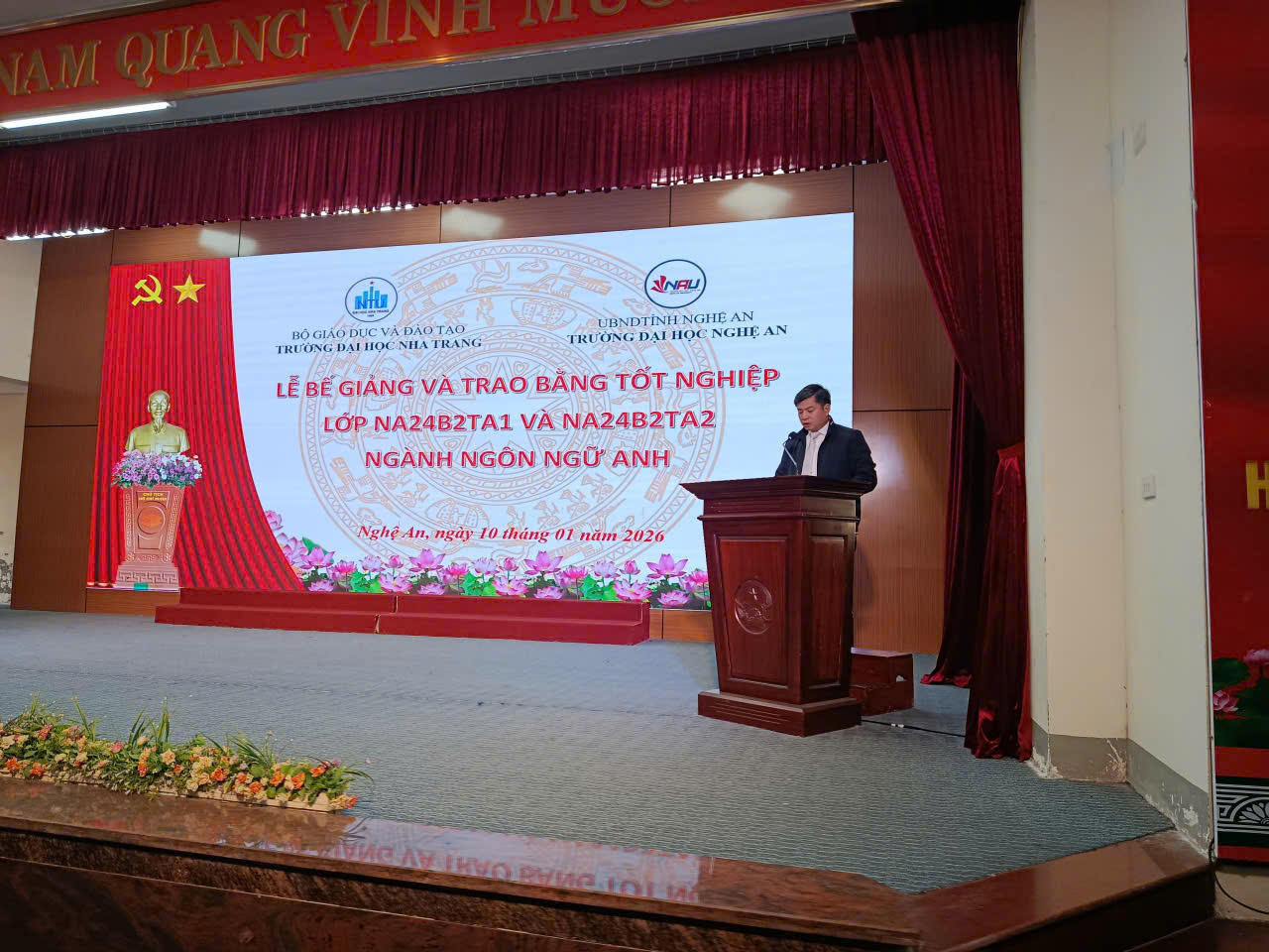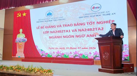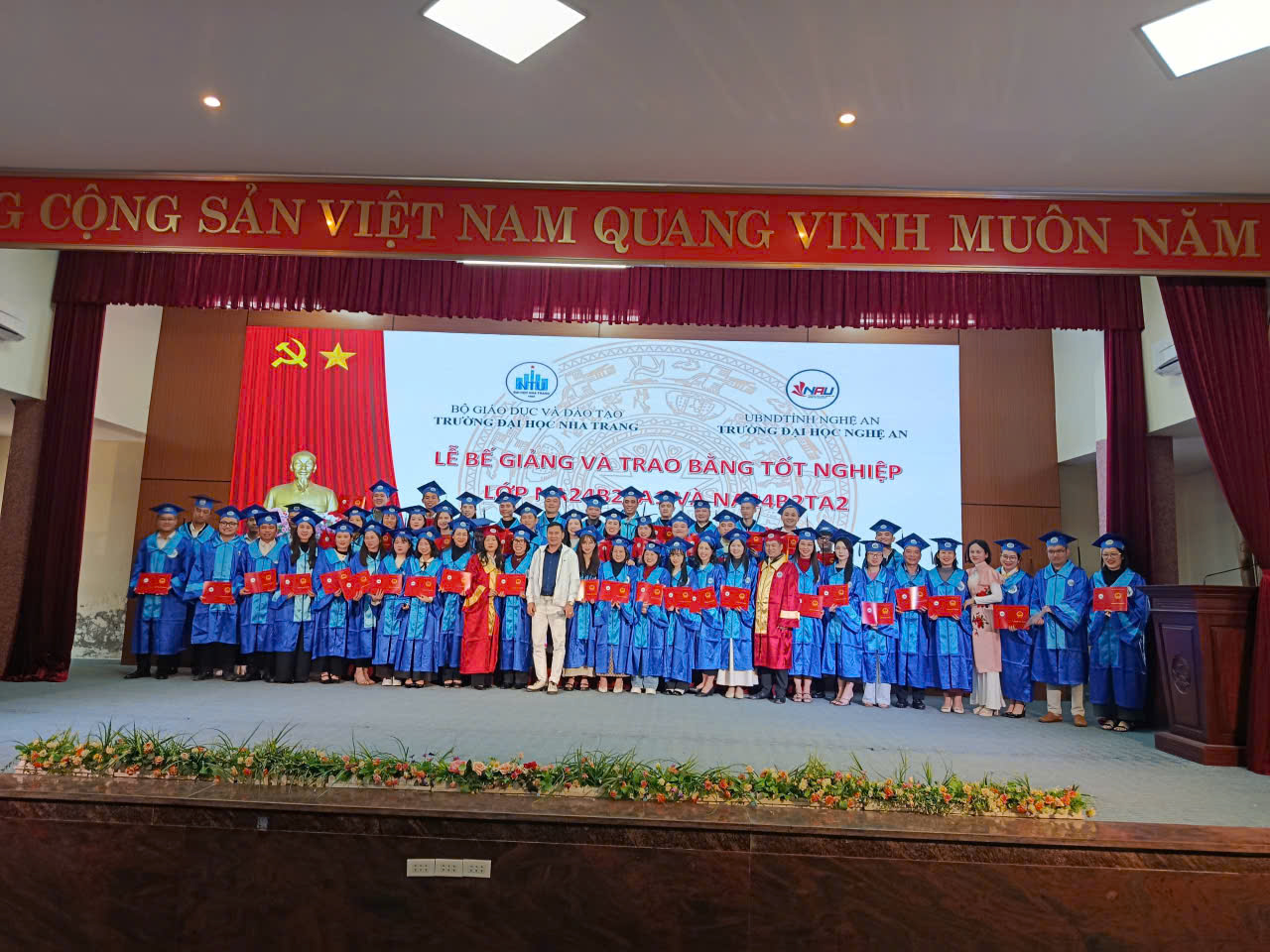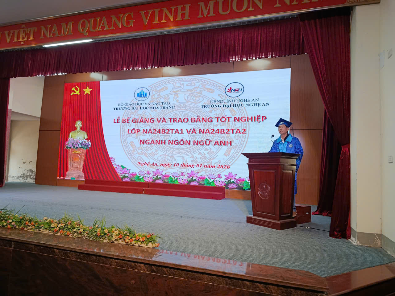 Để ghi nhận sự thành công đó ngày 10/01/2026 Trường Đại học Nghệ An phối hợp trường Đại học Nha Trang tổ chức lễ bế giảng và trao bằng Tốt nghiệp cho 124 học viên các lớp NA24B2TA1 và NA24B2TA2 niên khóa 2024-2026 tốt nghiệp tại trường Đại học Nghệ An