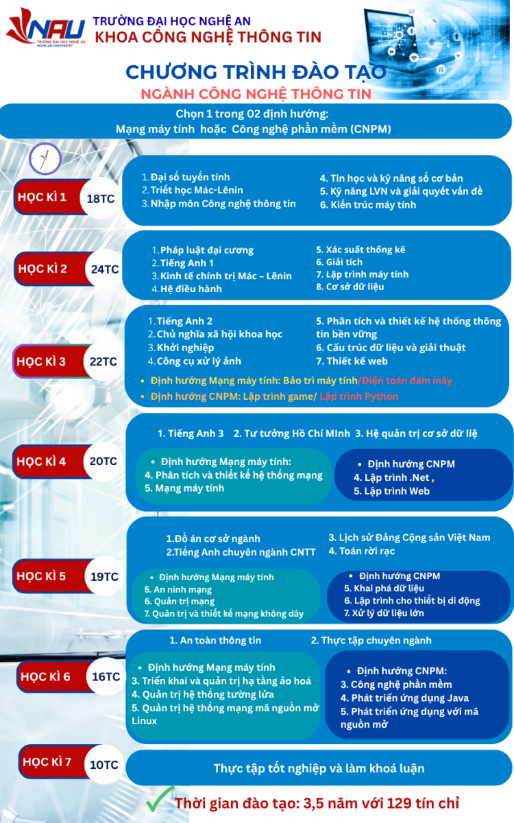 Chương trình đào tạo ngành Công nghệ thông tin (Ban hành kèm theo Quyết định 863/QĐ-ĐHNA ngày 22 tháng 7 năm 2025 của Hiệu trưởng trường Đại học Nghệ An về việc Ban hành chương trình đào tạo trình độ đại học các ngành) được thiết kế gồm 129 tín chỉ, được thiết kế chuẩn thời gian 3,5 năm, 7 kỳ. Tuy nhiên, nhà trường tổ chức thêm học kỳ phụ giúp sinh viên rút ngắn thời gian học tập theo nhu cầu của người học.